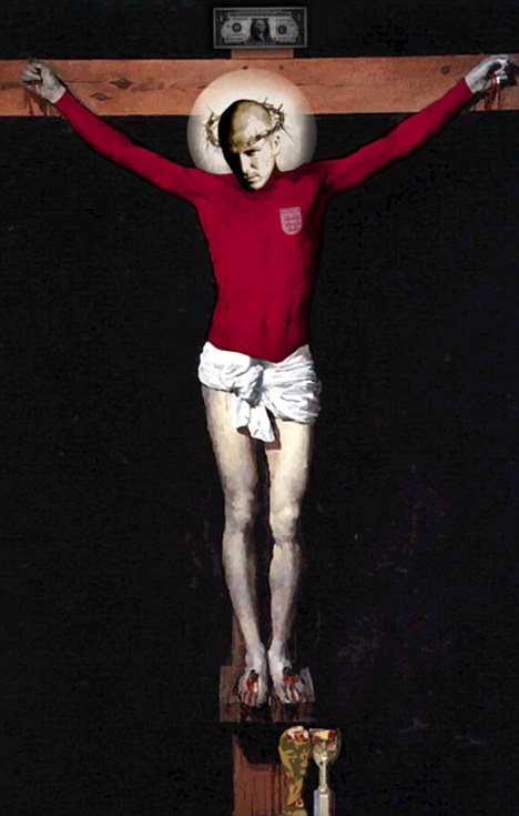 Beckham tiene una corona de espinas y a sus pies se puede ver el actual trofeo de la Copa del Mundo de la Fifa y el Jules Rimet, el antiguo. Adicional a esto hay un billete que posa sobre la cabeza del volante inglés.