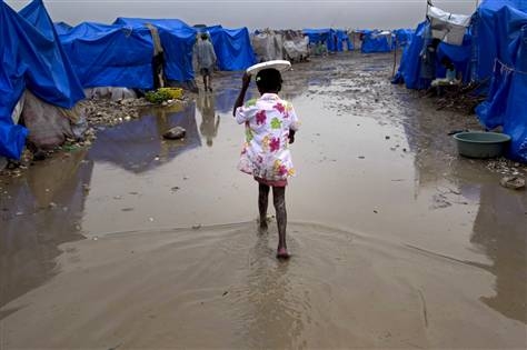 La lluvia empapó un campamento para víctimas del terremoto sin hogar en Port-au-Prince. Las promesas de que los campamentos vulnerables serán trasladados a sitios mejores no se han cumplido.