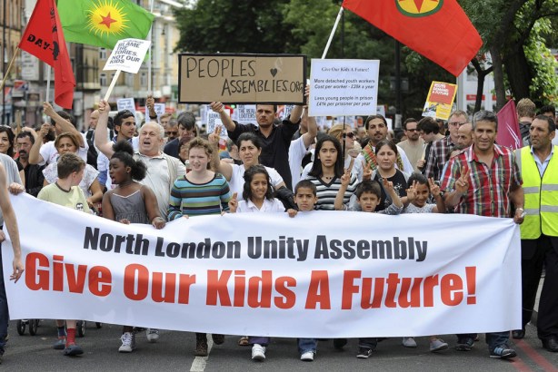 Varios centenares de personas han marchado por las calles del barrio de Tottenham una semana después de que comenzaran los disturbios en Reino Unido. Piden justicia por la muerte de Mark Duggan, el joven negro que murió hace nueve días abatido por la policía, la mecha que prendió la violencia callejera en el país y que ha acabado con más de 1.600 detenidos. Se quejan de la situación económica y social, pero también del sistema político que les representa, del que sienten que no forman parte.