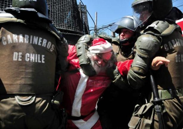Carabineros de la Policía de Chile detienen a un manifestante vestido de Papá Noel, el 22 de diciembre, durante una protesta estudiantil en Santiago llamada «La Última del Año».