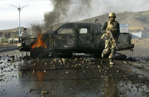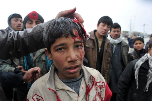 Un niño afgano herido a las puertas de la base. «Nosotros los afganos no queremos a estos cristianos e infieles, son el enemigo de nuestras tierras, nuestro honor y nuestro Corán», ha declarado Haji Shirin, uno de los que protestaba.