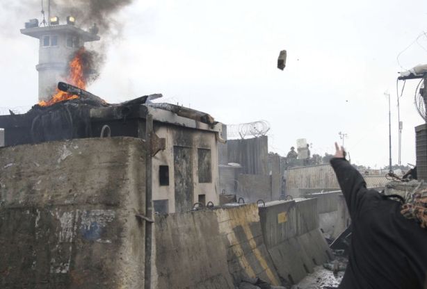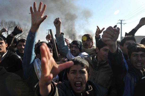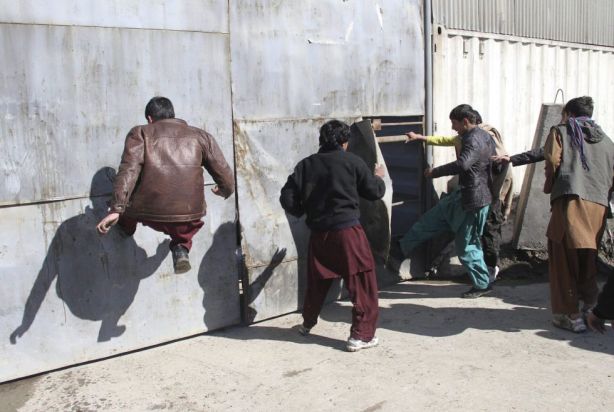 Varios afganos golpean las puertas de un edificio fortificado durante una manifestación convocada en protesta por la quema de un Corán por parte de soldados estadounidenses.  S. SABAWOON (EFE)