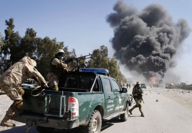 Fuerzas de seguridad llegan a la manifestación contra EE UU en las cercanías de la base de la OTAN en Jalalabad. RAHMAT GUL (AP)