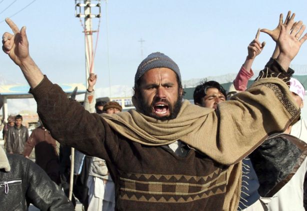 Unos hombres participan en un acto de protesta por la quema de ejemplares del Corán en una base de la OTAN, en Kabul.
