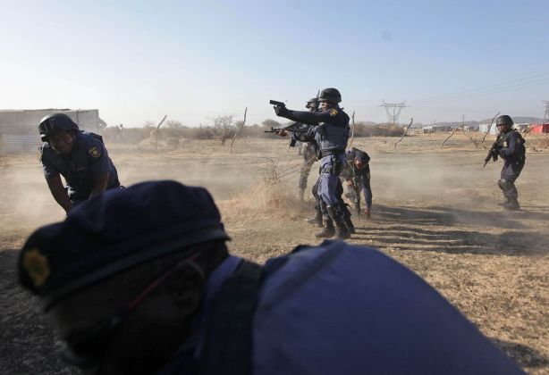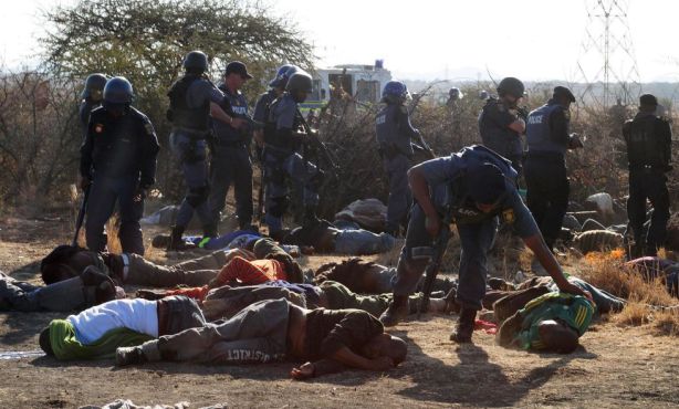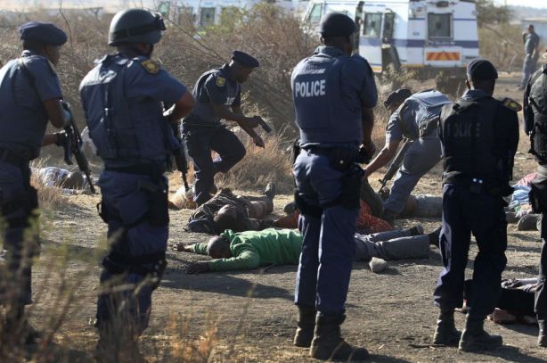 Policías rodean los cuerpos de mineros abatidos durante los enfrentamientos en la mina de platino de Lonmin, cerca de Rustenburg, Sudáfrica. Más de 3.000 mineros llevaban protestando por sus condiciones salariales desde el pasado viernes. (AP)