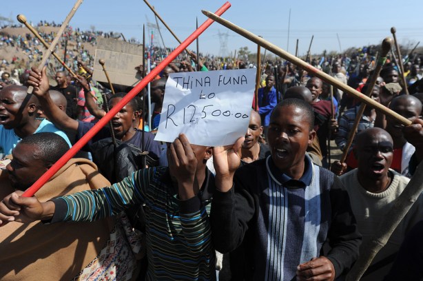 Mineros, armados con machetes y palos, participan en la protesta, antes de iniciarse el enfrentamiento con la policía. Más de 3.000 mineros llevaban desde el viernes reclamando mejoras salariales. (AFP)