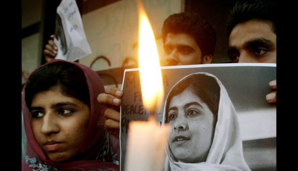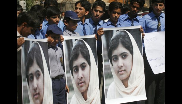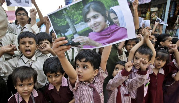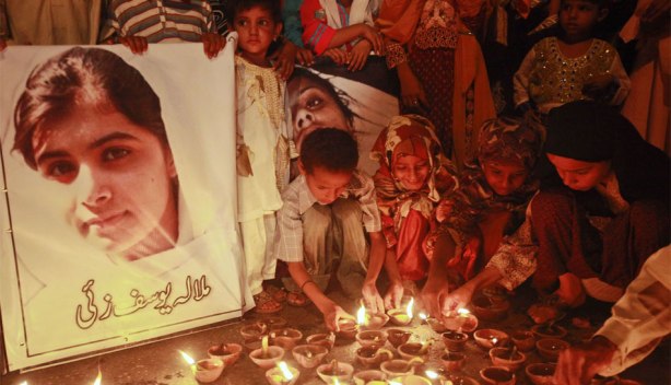 Niños le rezan a Malala Yusufzai. Ella fue tiroteada el martes por los talibanes en Pakistán en represalia por su defensa de la educación femenina. (Reuters)